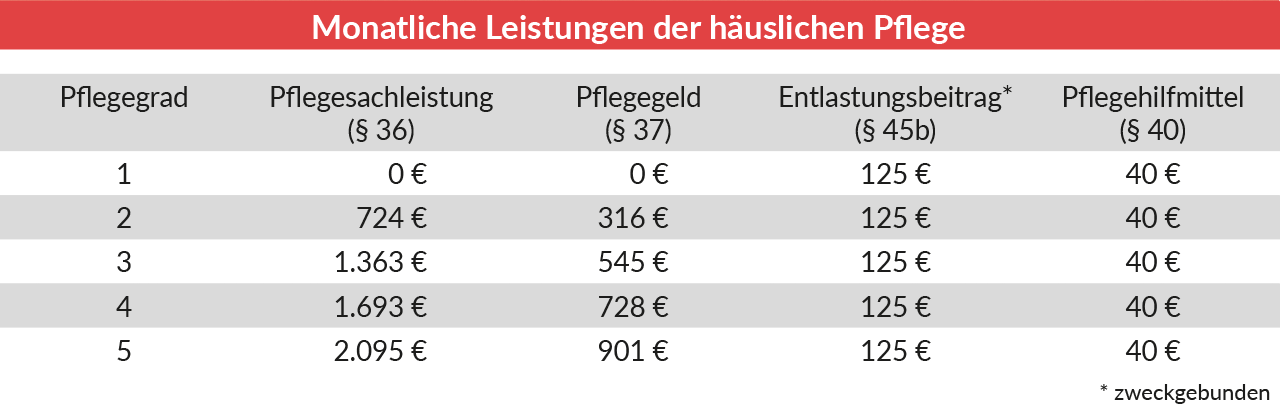 - ab Pflegegrad 1 steht Versicherten ein Entlastungsbetrag von bis zu 125 € monatlich z.B. für haushaltsnahe Dienstleistungen zur Verfügung