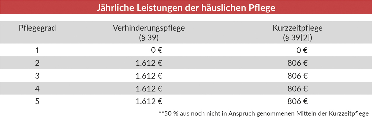 - ab Pflegegrad 2 (mind. 6 Monate) stehen Ihnen bis zu 1.612 €/Jahr Verhinderungspflege zur Verfügung. Ergänzend können bis zu 50 % des Leistungsbetrags für die Kurzzeitpflege (806 €/Jahr) für die Verhinderungspflege genutzt werden. Damit stehen bis zu 2.418 € im Kalenderjahr für die Verhinderungspflege zur Verfügung.